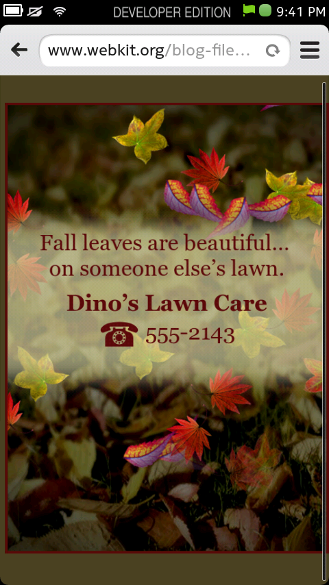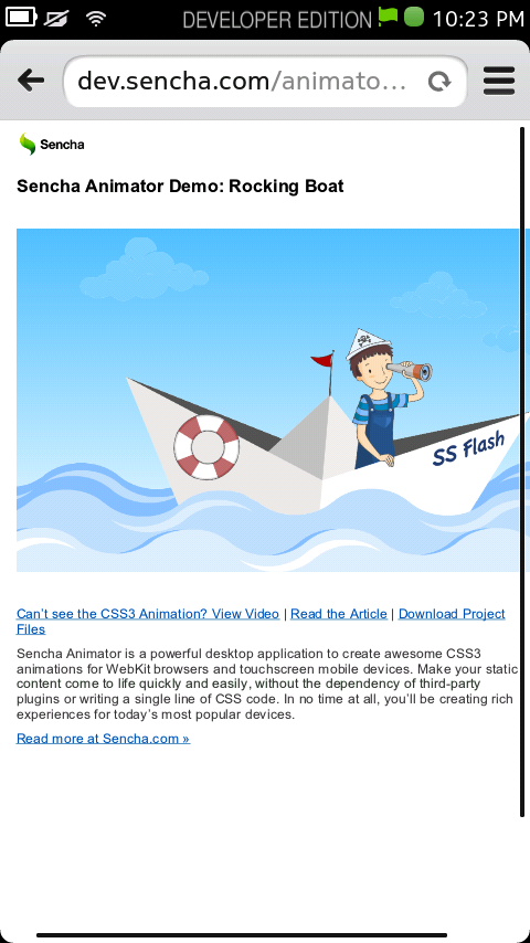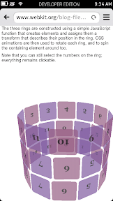 --> It is quite comprehensive, the browser can handle pretty much the common variants of modern web technologies (lacking only WebGL, IndexedDB, and some variants of input types). CSS3, SVG, and Canvas are well supported. Even CSS 3-D transform works well. Aria's favorite is