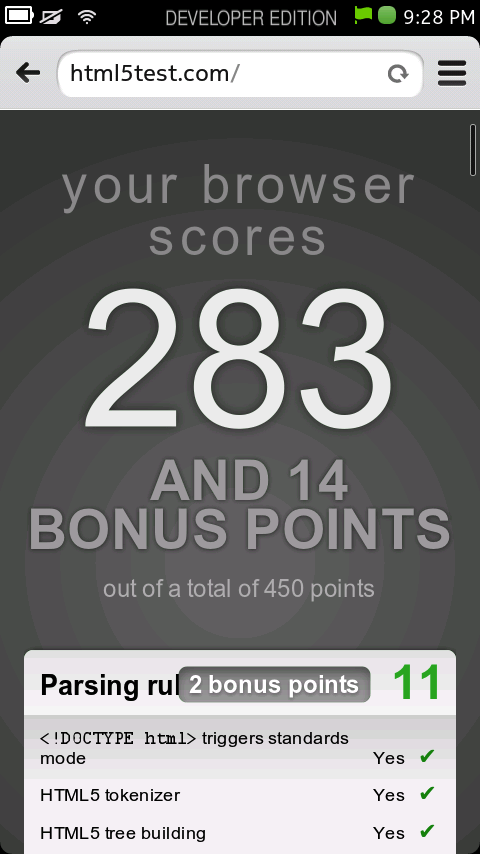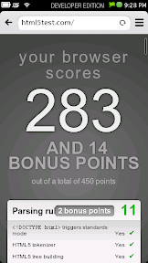HTML5 Test to check various features of the browser engine, it shows that the browser is getting the score of